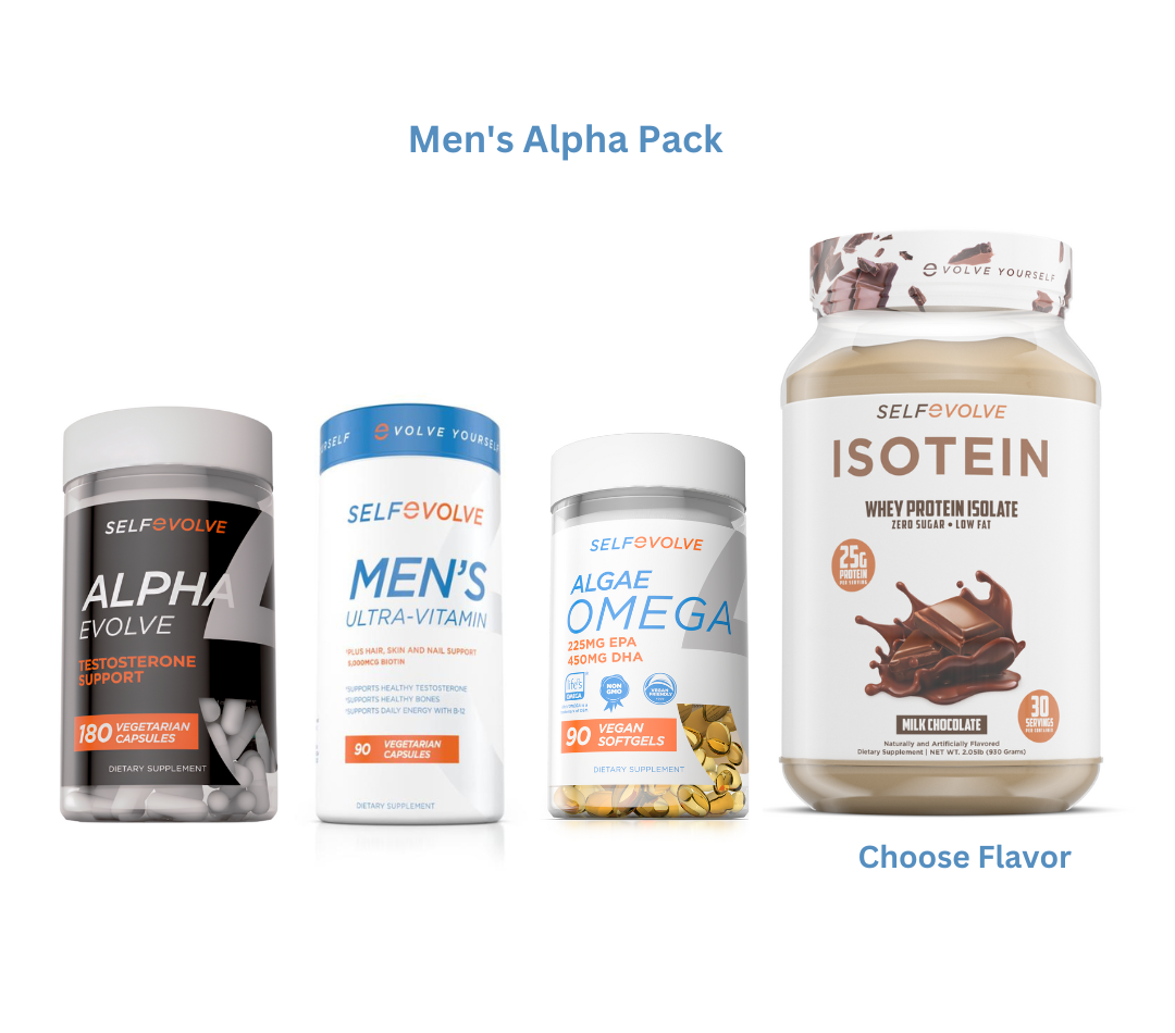This bundle is the perfect companion for active men: the Men's Alpha Pack. With testosterone support, multi vitamin, algae omega, and pure isolate protein powder, this bundle helps you reach your fitness goals. Stay healthy and energized with these well-rounded dietary supplements.