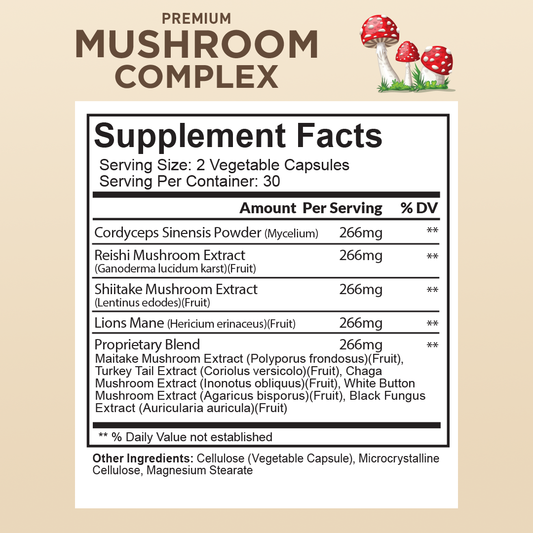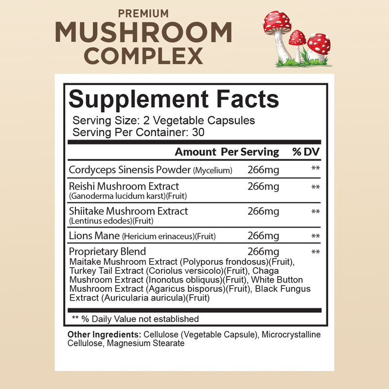 Mushroom Complex is a blend of premium super mushrooms lion's mane, cordyceps, reishi, and shitake mushrooms. Decrease stress, optimize energy levels, improve health.