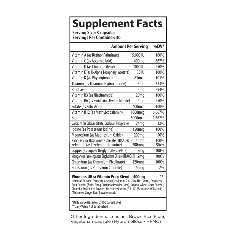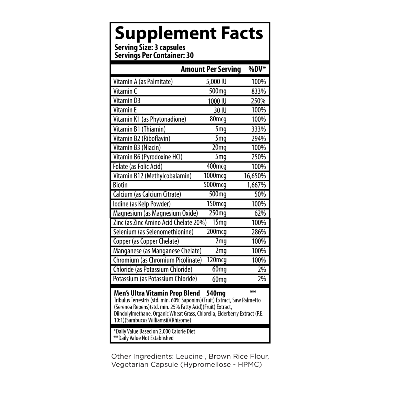 Our Ultra Vitamin 90 1-Month supply provides your body with essential multi-vitamins and minerals including 5,000mcg of biotin and 1,000iu of D3. Each capsule supplies a complete multi-vitamin and mineral formula that ensures your body is getting the comprehensive nutrition it needs. Plus, it's like an insurance policy against micro-nutrients.